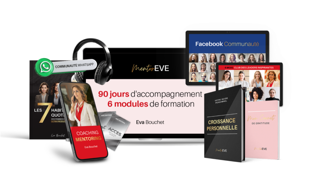 Le programme est composé de modules de formation en ligne, de sessions de coaching et mentoring avec Eva Bouchet, et d’un groupe Facebook privé pour échanger et se soutenir.